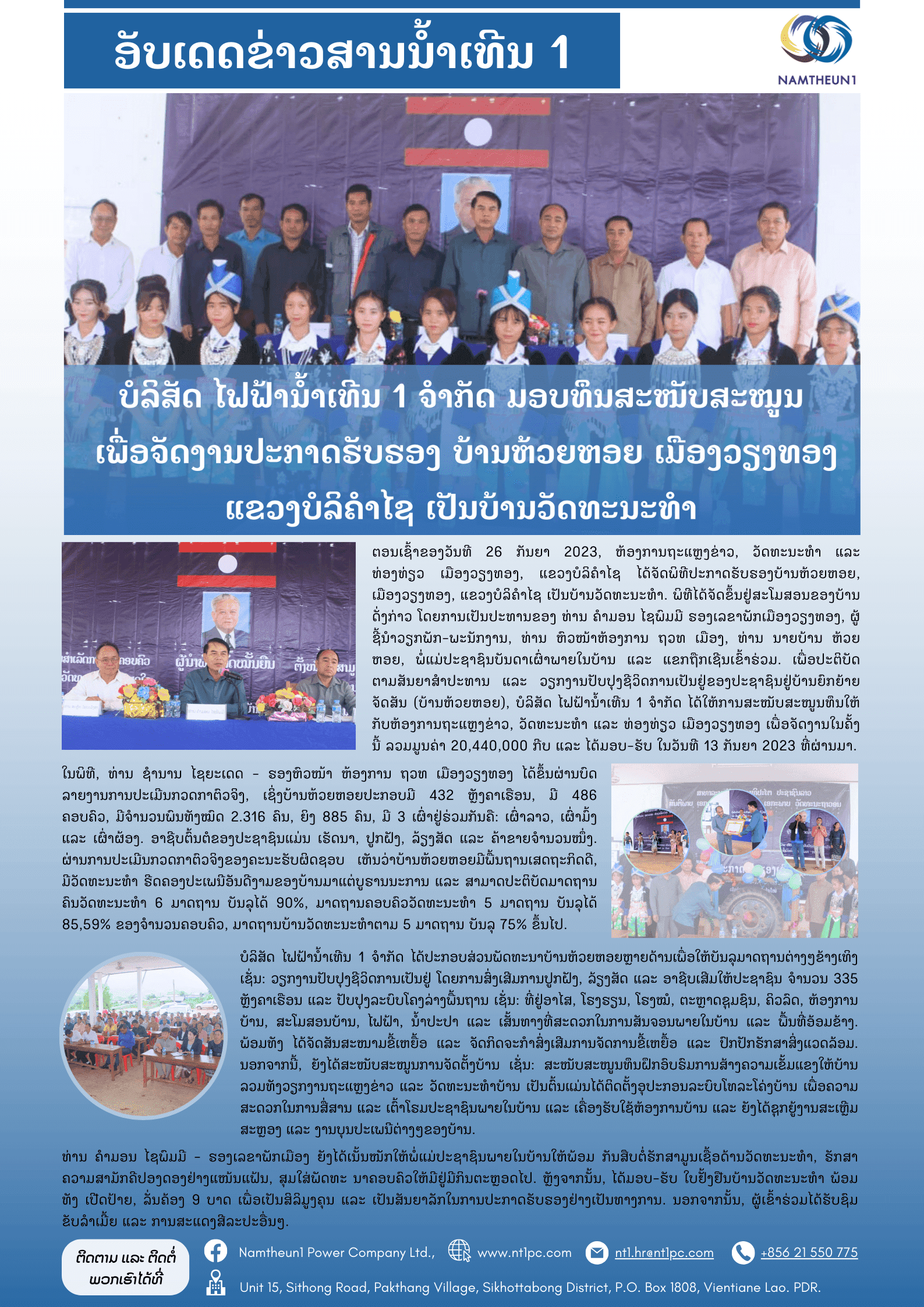 Previous item ... Next item ກອງປະຊຸມ ປຶກສາຫາລື ແລະ... —————————- ເບິ່ງວິດີໂອຂ່າວເພີ່ມເຕີມໄດ້ທີ່: https://www.facebook.com/100090726062275/videos/1550046242196638/ —————————- – ທ່ານຍັງສາມາດອ່ານຂ່າວສານນ້ຳເທີນ 1 ປະເດືອນ ສິງຫາ 2023 ສະບັບເຕັມໄດ້ທີ່: https://bit.ly/3ZWBnrP (ພາສາລາວ) in community contribution, community development, cultural village, hydropwer, Laonews, NT1PC